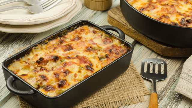 Dans la même poêle, faites revenir les lardons avec les oignons émincés. Préchauffez le four à 200°C.
