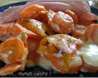 Disposez les carottes dans un plat. Détaillez le reblochon en tranches fines et posez le sur les carottes. Couvrez le tout de sauce.
