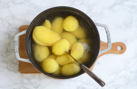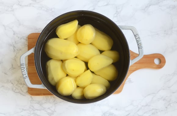 1Éplucher les pommes de terre et les faire cuire dans l'eau bouillante.