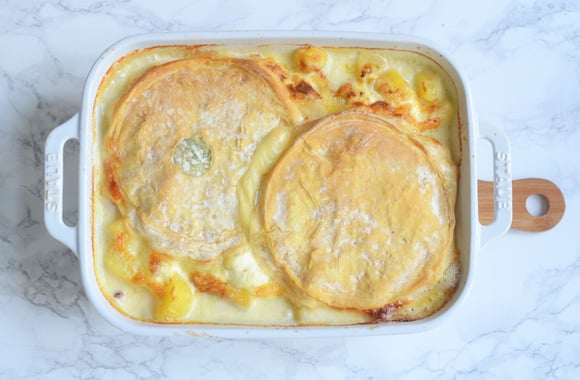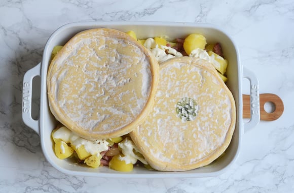 8Découper le reblochon en deux dans le sens de l'épaisseur et le déposer sur vos pommes de terre.