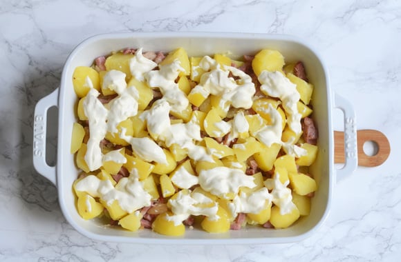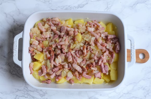6Ajouter la moitié des lardons et des oignons cuits. Ajouter le restant de pommes de terre coupées en lamelles ou en cubes et le restant de lardons et d'oignons cuits.