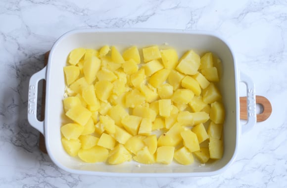 5Beurrer un plat à gratin. Couper en grosses lamelles ou en cubes la moitié des pommes de terre et les mettre au fond du plat à gratin.