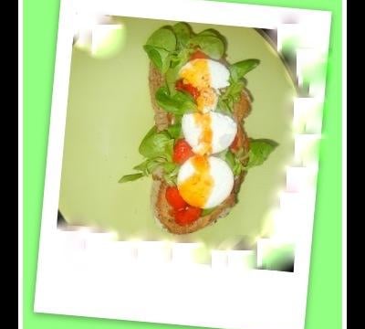 Posez les tranches de pain dans des assiettes, ajoutez quelque feuilles de roquette, les tomates confites, les rondelles de fromage.