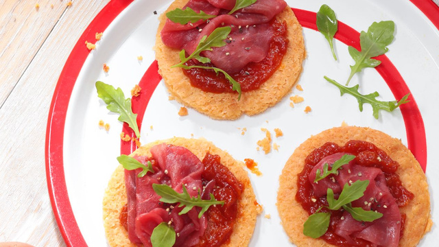 Rouler les tranches de filet de bœuf, les farcir avec le ketchup à la sauce TABASCO® Rouge et les déposer sur les sablés. Décorer de jeunes pousses de salade arrosées d’un filet d’huile d’olive et assaisonnées d’un tour de moulin à poivre.