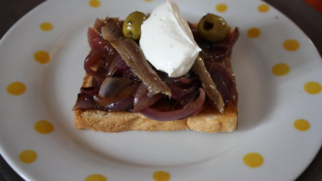 Disposer, aussitôt sur chaque tranche de pain de mie un peu de fondue d'oignons chaude puis 2 filets d'anchois et 2 olives vertes terminer par une quenelle bien froide de St Môret®.