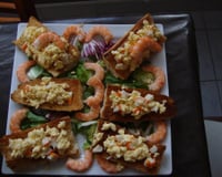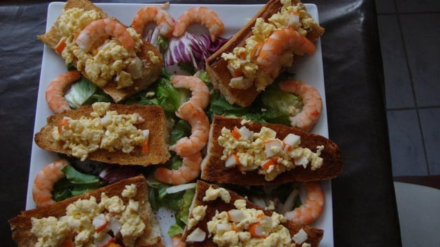 Mélangez 6 oeufs avec 20cl de crème liquide, sel, poivre, surimi haché, et faire des oeufs brouillés. Tartinez les oeufs sur le pain.