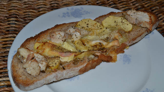 Laver la pomme et la détailler en tranches. Répartir le reblochon (ou un autre fromage de votre choix) sur la tranche de pain. Disposer alternativement le poulet et la pomme. Parsemer un peu de gruyère râpé. Placer quelques minutes au four préchauffer à 200°c.