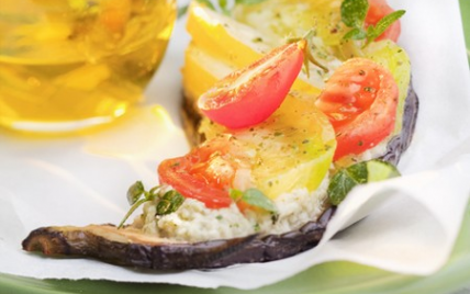Déposer les tranches d'aubergine sur les assiettes de service, tartiner de crème d'ail puis alterner des quartiers de tomates. Saupoudrer d'herbes, saler, poivrer. Ajouter éventuellement un filet d'huile d'olive et un trait de vinaigre balsamique. Servir tiède ou froid. - 3