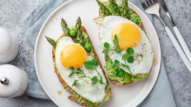 Faites griller légèrement les tranches de pain, tartinez-les avec l’avocat, ajoutez les asperges et les petits pois.