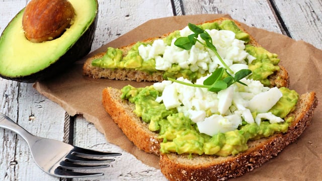 Garnissez les tranches de pain grillé avec le jaune d'oeuf. Recouvrez avec l'avocat et finissez avec le blanc d'oeuf. Agrémentez de jeunes pousses.