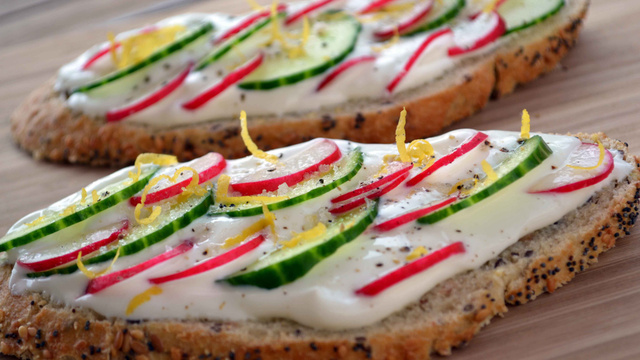 Tartinez généreusement les tranches de pain avec le fromage blanc.