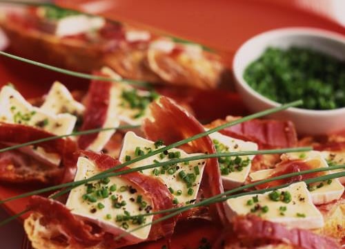 Couper les Mini Caprice en tranches et rouler ces dernières dans la ciboulette. Intercaler les tranches de Mini Caprice et le jambon sur la tartine. Ajouter un filet d'huile d'olive, et parsemer de poivre du moulin.