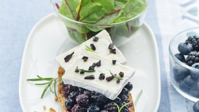 Badigeonner les tranches de pain d’huile d’olive. Dorer les tranches de pain. Disposer les fruits dans une poêle. Saupoudrer de sucre, d’une pincée de sel et d’un peu de poivre. Cuire 3 minutes, en remuant délicatement. Répartir les baies sur les tranches de pain chaudes.