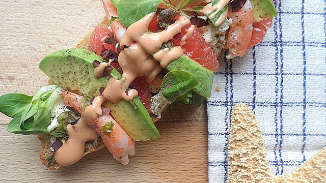 Revisiter une salade fraîche que j'adore (avocat-crevettes-pamplemousse & sauce cocktail) en tartine.