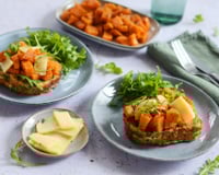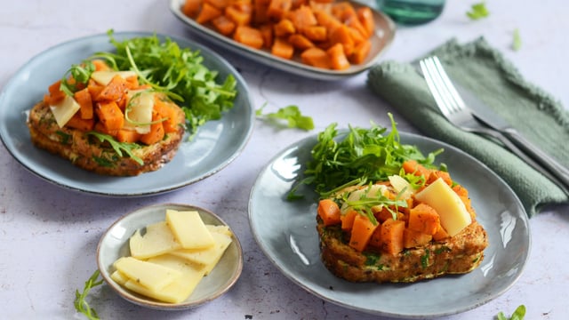 Placez les tranches de pain perdu sur des assiettes puis garnissez-les de dés de patate douce rôtis.