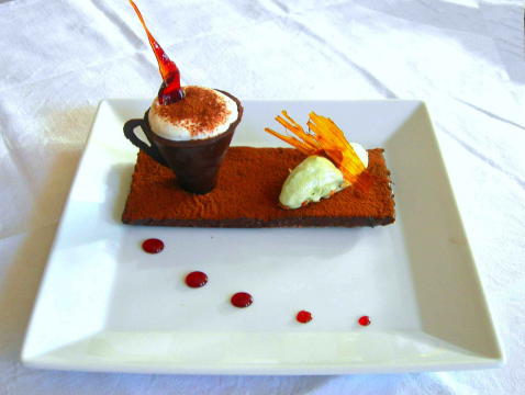 Couper le sommet du cône en chocolat sur 1,5 cm et l'incruster dans le dacquois sur la gauche (on aura préalablement enlever un peu du biscuit à l'aide d'un emporte-pièce), coller la hanse puis garnir le cône avec le crémeux chocolaté aux bulles de thé vert. Déposer une cuillère de mousse noisette puis soupoudrer de cacao (de manière à ce que la tasse ressemble à un « cappuccino »), disposer la quenelle de glace au thé vert, sur des noisettes grillées concassées, puis sur la droite du dacquois. Ajouter une cuillère en sucre rouge dans la tasse, et un décor en sucre sur la quenelle de glace.