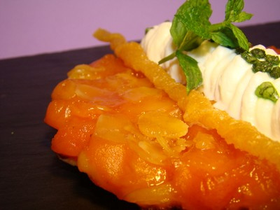 - La chantillyFaites tiédir la crème liquide, ajoutez les feuilles de menthe, laissez refroidir puis infuser pendant 2 heures au réfrigérateur. Filtrez ensuite la crème bien froide, et montez-la en chantilly. Réservez au frais.Les tatinsPréchauffez votre four à 180°C (th.6). Dans une casserole, faites chauffer le sucre semoule sur feu vif, jusqu'à ce qu'il caramélise. Lorsqu'il prend couleur, mélangez-le et ajoutez le sirop d'orgeat. Versez le caramel dans 4 moules à tartelettes. Saupoudrez chaque moule d'une cuillère à soupe d'amandes effilées. Dénoyautez les abricots et émincez-les. Rangez-les dans chaque moule en formant une jolie rosace. Etalez la pâte sur votre plan de travail fariné, sur une épaisseur d'environ 5mm. Découpez à 4 fonds de pâte de la même dimension que vos moules, piquez-les à l'aide d'une fourchette, et déposez un fond sur chaque rosace d'abricots, en rentrant bien les bords vers l'intérieur. Faites cuire au four environ 20mn. Laissez tiédir et démoulez délicatement.DressagePosez une tatin sur chaque ardoise. Dressez la chantilly mentholée, à l'aide d'une poche munie d'une douille cannelée, décorez d'une sommité de menthe, d'une torsade de caramel à l'orgeat, et de quelques pépites de feuilles de menthe cristallisées. Servez aussitôt !