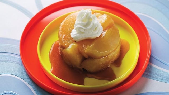 Démoulez la Tatin de poires sans pâte sur une assiette. Vous pouvez la tiédir 15 min au four à 150°C (th. 5) avant de la servir telle quelle ou avec une chantilly.