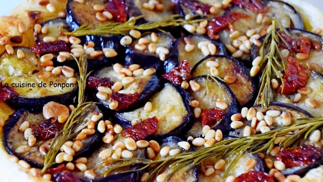 Ajouter les tomates séchées émincées, les pignons, le romarin puis ajouter les tranches d'aubergines en les chevauchant légèrement, en gardant 1 cm du bord libre. Parsemer un peu de romarin semi-frais.