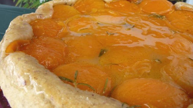 Une pâte sucrée que j'ai choisie brisée et composée de noisettes en poudre , un petit régal qui s'accommode parfaitement à un beau fruit de saison : l'abricot et pour la touche d'originalité : un peu de romarin ...