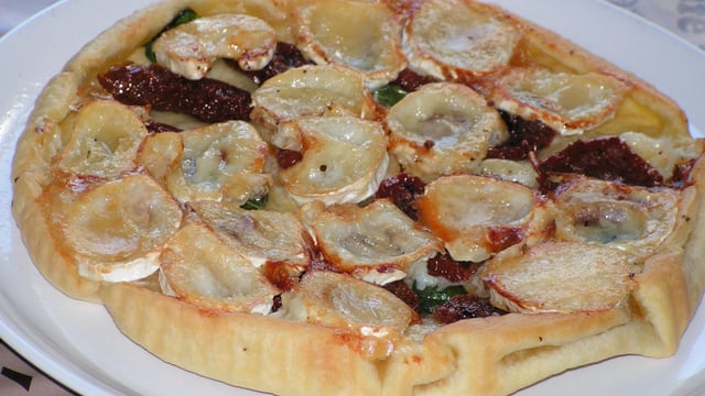 Huiler le fond d'un moule à tarte et disposer le fromage coupé en rondelle puis les tomates confites. Parsemer de basilic, saler et poivrer. Recouvrir de la pâte en enfonçant délicatement les bords.