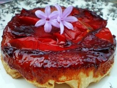 Tarte façon tatin à la tomate. La tomate précuite au four à l'huile d'argan donne cette douce saveur de noisette et le caramel balsamique apporte une touche de douce acidité sucrée.