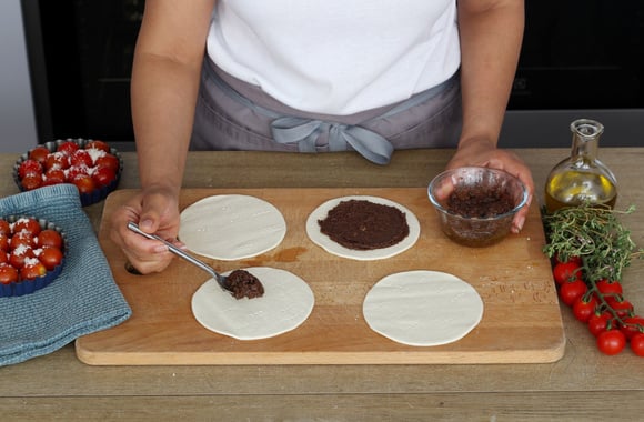 7Tartinez les cercles de pâte avec la tapenade noire Jean Martin.