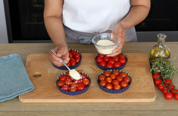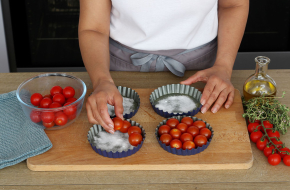 3Répartissez les tomates cerises dans les moules en les serrant un peu.