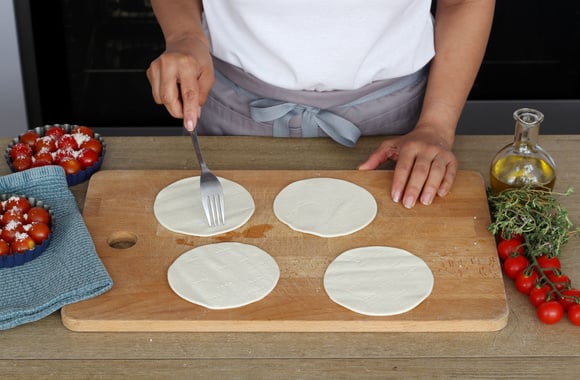 8Couvrez les tomates cerise dans chaque moule avec un cercle de pâte feuilletée tartiné de tapenade.