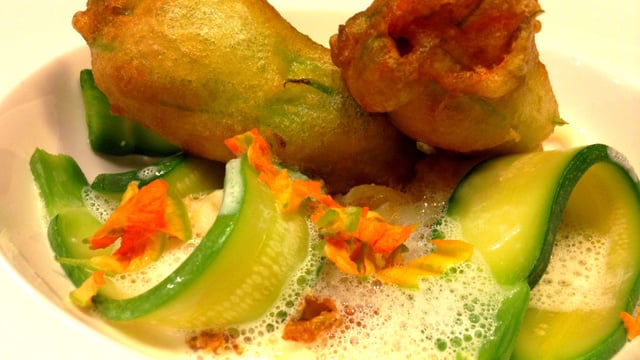 Des fleurs de courgettes farcies avec un risotto au courgettes et seiches qui reposent sur de fines lamelles de blanc de seiches et de mini-courgettes. Le tout accompagné d'une petite écume de parmesan