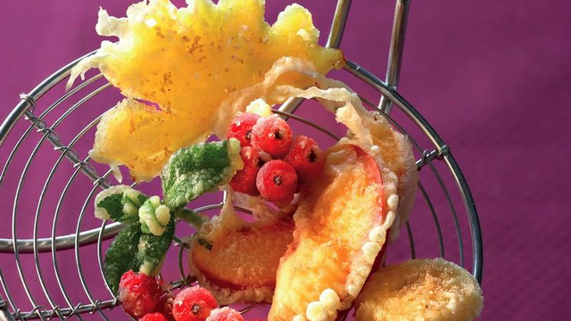 - 2Faire chauffer l'huile de friture (180 °C).Peler tous les fruits, les couper en morceaux.Les plonger dans la pâte avant de les faire frire dans l'huile.