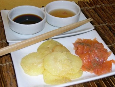 Trempez les chips de pommes de terre dans la pâte à tempura puis faites les dorer par petites quantités à la fois, 2 à 3 min dans le bain de friture. Egouttez les sur du papier absorbant. Servez bien chaud accompagné des sauces et du saumon.
