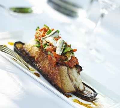 - 6Retirer et déposer sur assiette décorée de feuilles de roquette et boquerones en filet.Finir avec fleur de sel, poivre du moulin et un trait d'huile d'olive.