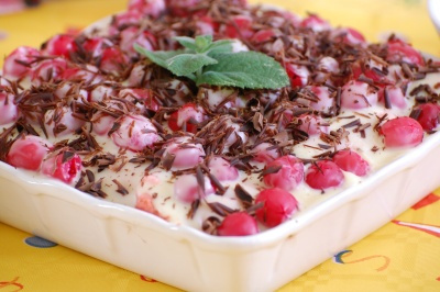 Couvrir la préparation au fromage blanc avec la crème au chocolat blanc et avec les cerises restantes.