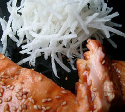 Servir le saumon avec le radis noir et verser un peu de sauce dessus.