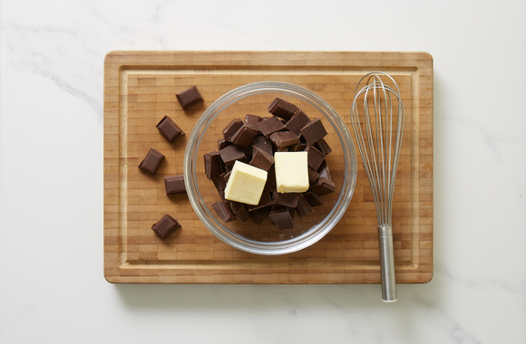 1Dans un bol, mettez le chocolat noir coupé en morceaux et le beurre et faites-les fondre au bain-marie ou au micro-ondes.