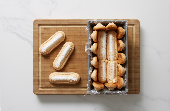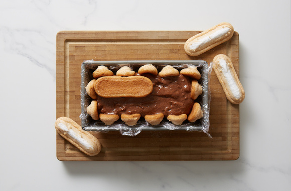 8Tapissez les parois du moule à cake ainsi que le fond du moule de biscuits à la cuillère.