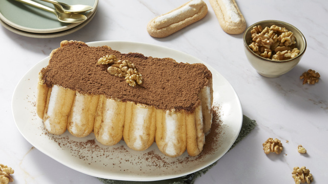 12Saupoudrez le haut de la terrine avec le cacao en poudre puis décorez avec les cerneaux de noix.