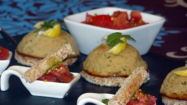 Ces belles bouchées de terrine au thon coeur fromage fondu si raffinées et festives....à déguster en entrée accompagnées de tartare de tomate au pesto...