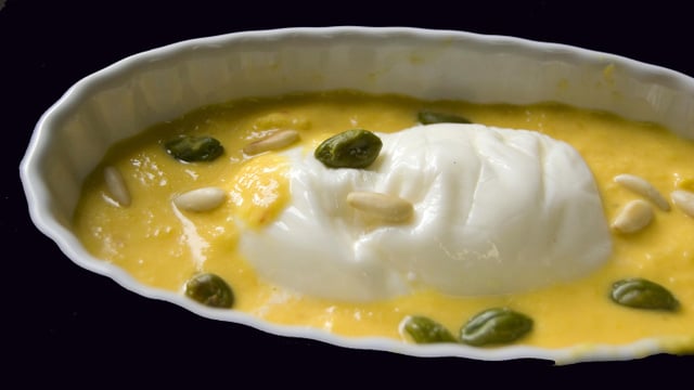- 3Faire griller les pistaches et les pignons dans une poêle à feu vif.Mettre le fromage dans un plat.L'entourer de sauce.Garnir avec les graines.