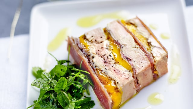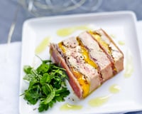 Poêler les escalopes de foie gras à feu vif, puis terminer leur cuisson au four pendant 1 min. Les assaisonner et les laisser refroidir, puis les couper en 2 dans l’épaisseur.Tailler le jambon en fonction des dimensions de l’emporte-pièce rectangulaire choisi.