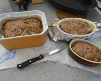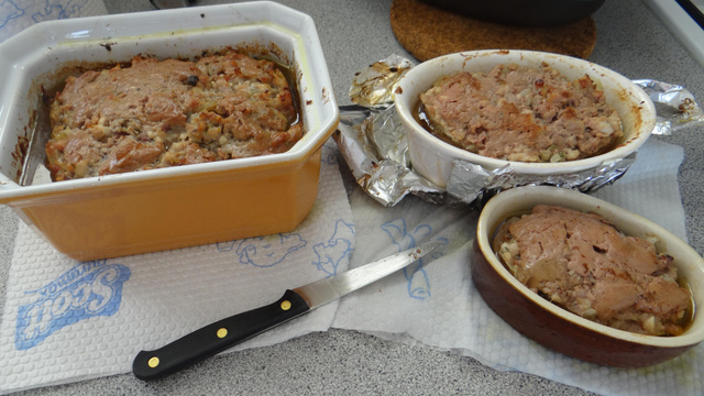 Une couche du mélange viande jusqu'à mi-hauteur de la terrine, une couche de foie gras, puis encore viande presque jusqu'en haut et encore couche de foie gras. Cuire 1h, 220° (th6/7) au four au bain-marie et ça donne ça. Laisser refroidir puis mettre au très frais du frigo avant de consommer. Ya plus qu'à !