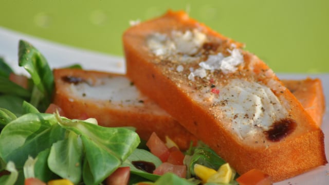 Déposez dessus 2 tranches de terrine. Saupoudrez de fleur de sel et poivre. Accompagner d'une vinaigrette. Pour plus d'idées venez faire un tour sur mon blog. Aux délices du sud. A très bientôt.