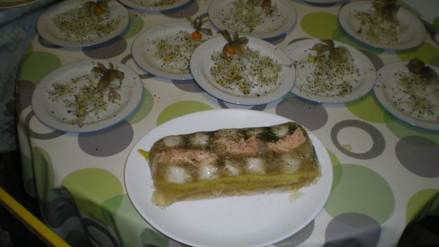 Disposer les noix de Saint Jacques puis les blancs de poireaux de chaque côté, saupoudrer de piment et répartir le saumon restant. Parsemer d'aneth et compléter par le fumet. Rabattre le film étirable et poser des poids sur la longueur. Réserver 12h au réfrigérateur. Servir la terrine avec une sauce à la crème fraîche, aneth, citron.