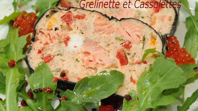 Cuire au four au bain marie (la terrine posée dans un plat contenant de l'eau) 30 minutes à 200°. Au sortir du four laisser reposer. Lorsqu'elle est froide, laisser écouler le jus qui est peut-être formé. Laisser finir de prendre au fridge quelques heures. Servir bien frais mais pas froid.