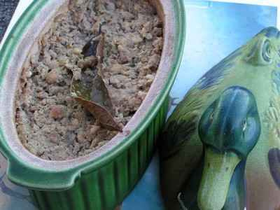 Ajouter les autres ingrédients, l'oeuf en dernier.Verser dans la terrine et poser dessus une branche de thym et une feuille de laurier.