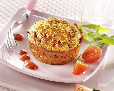 Démouler dans chaque assiette, verser un cordon de coulis de tomate, parsemer des tomates cerises coupées en 2 et des feuilles de roquette.