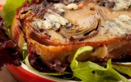 Intercaler dans la terrine l'appareil à flan, la Fourme d'Ambert, les pignons et les noix, les pommes et les quartiers d'artichauts puis filmer et cuire au bain marie au four à 120°C, pendant au moins 1 heure, température à coeur de minimum 65°C. Puis laisser refroidir une nuit au frigo. - 4