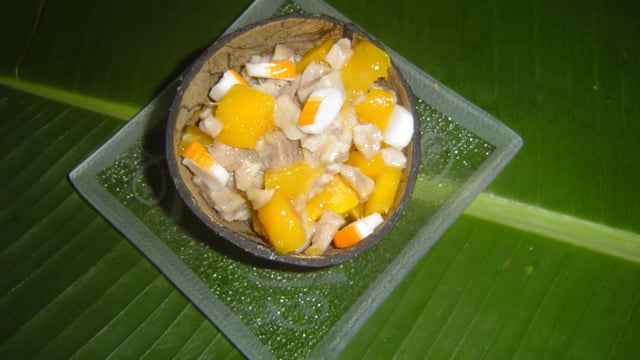 Au bout de 2 heures de marinade au frais, mélanger la mangue et le coraya au thon. Dresser et servir, accompagné de riz blanc.