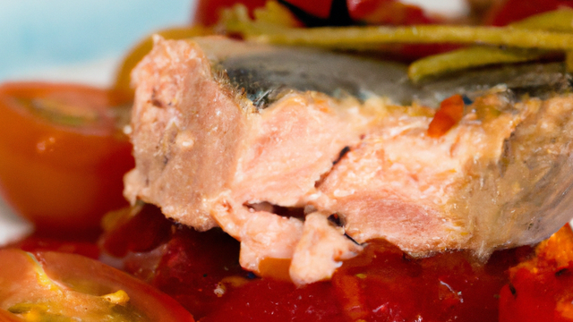 thon rouge frit et cuit avec tomates et poivrons.